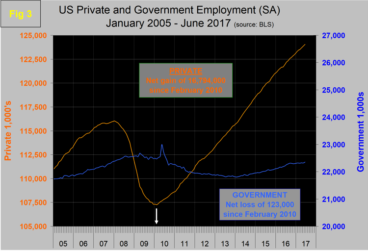 The Bureau of Labor Statistics (BLS) net job creation report released on Friday exceeded economists’ expectations and was another example of why we should not be fixated on a single month’s result. On the face of it, March was terrible at only 50,000 more people employed than in February. In the data released on Friday, April was revised up by 33,000 to 207,000 and May was revised up by 14,000 to 152,000. The preliminary June result was 222,000 jobs created. Clearly the single month number is useless in its ability to measure the trend. The average monthly increase in the 12 months of July 2016 through June of 2017 was 187,000. Coincidentally, private employment increased 187,000 in June and government gained 35,000. The unemployment rate increased from 4.3 percent in May, which was the lowest since February 2001, to 4.4 percent in June.