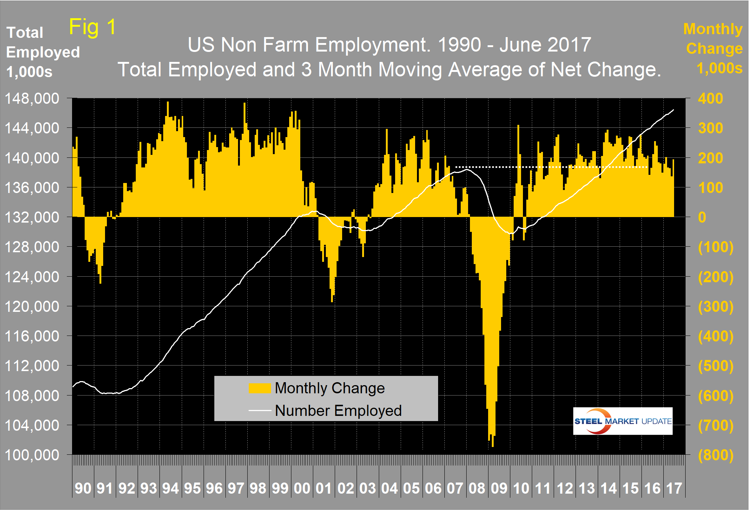 SMU Comment: The U.S. Gross Domestic Product is the values of goods and services produced by all economic activity. The growth of GDP is a function of the growth in the number of employed people multiplied by the growth of their productivity. Steel consumption is correlated to GDP, therefore to understand the direction of the steel market it is useful to know more about the growth in employment. The BLS monthly report of net job creation presents the big picture and enables us to drill down into sub sectors such as manufacturing and construction. This is therefore valuable in understanding the drivers of our particular steel business. The employment situation is good and has been described as “full” by some analysts. June 2017 was the 87th consecutive month of job growth on a 3MMA basis. The mid 90s was the longest sustained period of job growth since the 1940s when the streak was 96 months.