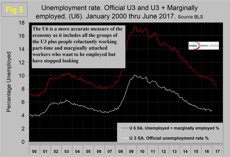 The official unemployment rate, U3, reported in the BLS’s household survey (see explanation below), came in at 4.4 percent in June, which was up from 4.3 percent in May but down from 4.9 percent in June last year. This number doesn’t take into account those who have stopped looking for work. The more comprehensive U6 unemployment rate declined from 9.6 percent in June 2016 to 8.6 percent in June 2017 (Figure 5). U6 includes workers working part time who desire full-time work and people who want to work but are so discouraged they have stopped looking. The differential between these rates was usually less than 4 percent before the recession, but is still 4.2 percent. It has been estimated that the economy needs to create about 150,000 jobs per month to keep up with population growth. In the last 12 months, the average monthly job creation has been 187,000, so the impact on unemployment has been about 37,000 per month.
