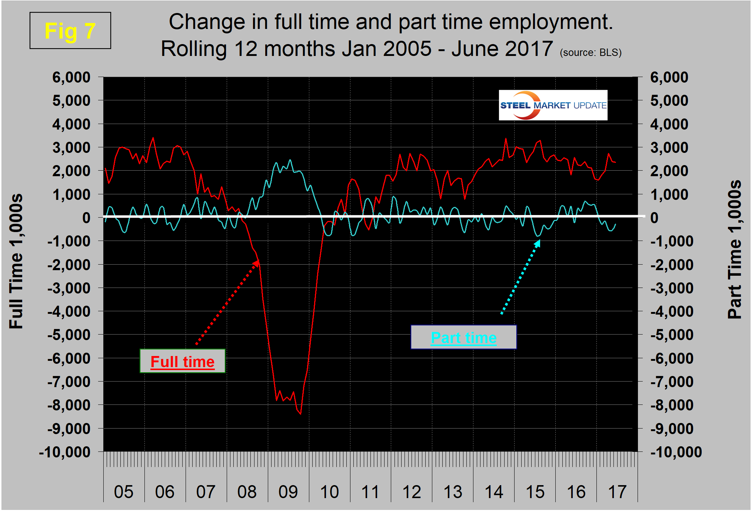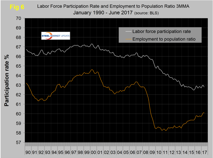 The employment participation rate at 62.8 percent in June hasn’t changed much in the last 12 months. We’re not sure what this is a percentage “of” because of the multiple descriptions of the labor pool. Another measure is the number employed as a percentage of the population, which we think is much more definitive. In June, this measure was 60.1 percent, up from 59.6 percent in June last year and from 59.3 percent in June 2015. The employment to population ratio has broken out of its 2016 slump in the last six months. Figure 6 shows both the participation rate and the employment to population ratio on the same graph.