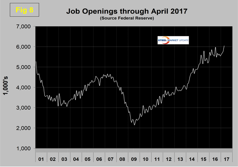 The job openings report known as JOLTS is reported on about the 10th of the month by the Federal Reserve and is over a month in arrears. Figure 8 shows the history of unfilled job openings through April when openings stood at 6,044,000, an all-time high. There has been an improving trend since mid-2009.