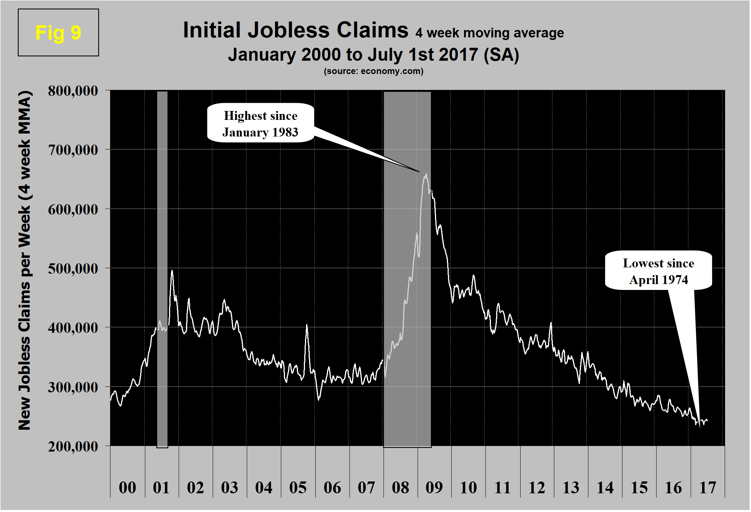 Initial claims for unemployment insurance, reported weekly by the Department of Labor, have continued their downward drift this year. In the week ending July 1, they were 248,000 with a four-week moving average of 243,000. This marks the longest streak since 1973 of initial claims below 300,000 (Figure 9). The result for the week ending Feb. 4, 2017, at 231,000, was the lowest in 43 years (April 1974).