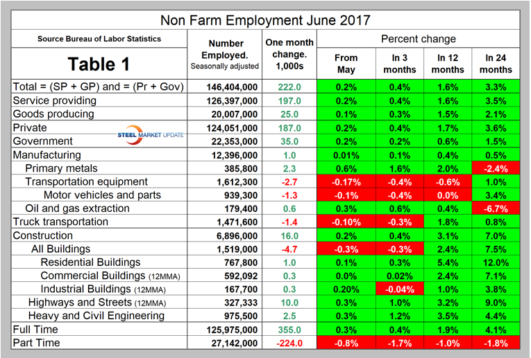 Table 1 breaks out the total number employed into private, government, service- and goods-producing industries and the change in those sectors in the latest month of data. It includes the percentage growth in three, 12 and 24 months. Most of the goods-producing employees work in manufacturing and construction. We have identified the components of these two sectors that are most relevant to steel consumption. In June, 187,000 jobs were created in the private sector and government gained 35,000. Not relevant to steel, but of interest from the point of view of where our tax dollars go, the federal government gained 4,000 as local governments gained 35,000 and state governments lost 4,000 jobs.
