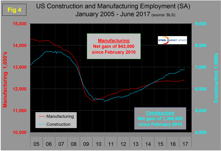 Construction was reported to have gained 16,000 jobs in June and is up by 113,000 in the first half of 2017. Some of the major construction subcategories are routinely reported one month in arrears, which distorts the data in Table 1. These include industrial buildings, commercial buildings, and highways and streets. Construction has added 1,396,000 jobs and manufacturing 943,000 since the recessionary employment low point in February 2010 (Figure 4). Construction has leapt ahead of manufacturing as a job creator, but the growth of construction productivity is very low (or non-existent), in contrast to manufacturing where it is very high. The difference is the difficulty of automating construction jobs.