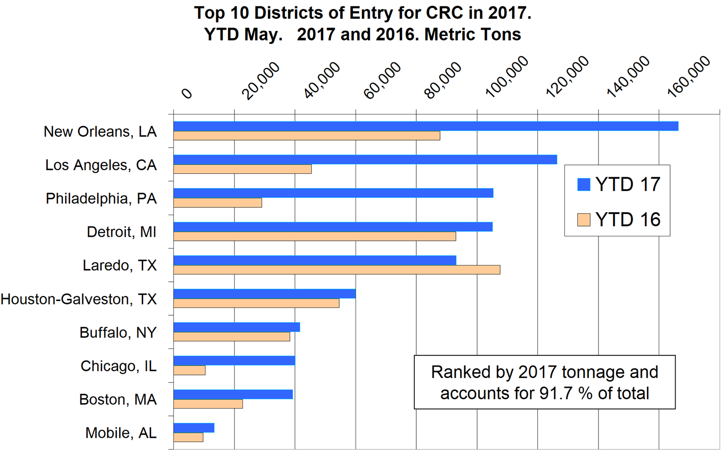 The chart shows graphically the tonnage of CRC that entered the top 10 districts in YTD May for 2016 and 2017 and is ranked by 2017 tonnage. These 10 districts account for 91.7 percent of the grand total in 2017. New Orleans received the most tonnage through May 2017 and was up by 89 percent year over year. Los Angeles was in second place by volume, up by 178 percent.