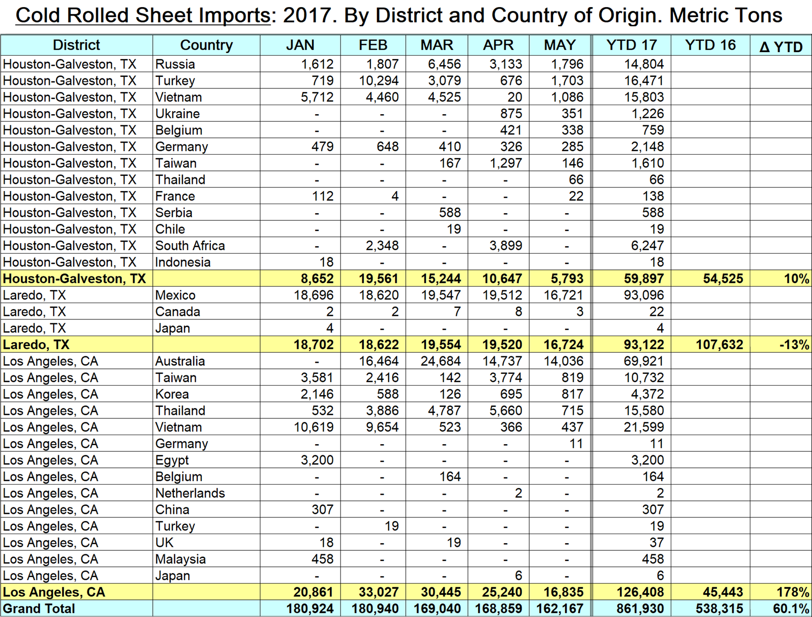 This month, we will use CRC to make our point. In 2017 through May, 861,930 metric tons of CRC entered the country, which was an increase of 60.1 percent from the first five months of 2016. As an illustration of regional differences, Philadelphia was up by 263 percent and Laredo was down by 13 percent. The table included here (click to enlarge) is a small extract from one of the four spreadsheets in the premium section of our website, which spell out the monthly tonnage by source for 33 districts around the country for HRC, CRC, HDG and OMC.