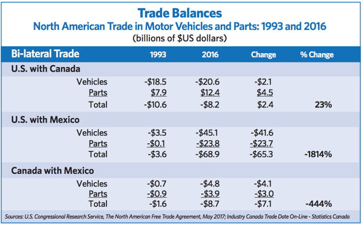 In a joint statement, the United Autoworkers and Canadian association UNIFOR noted that the trade deficit for motor vehicles and parts between 1993 and 2016 has grown dramatically with Mexico. The overall automotive trade deficit for the U.S. rocketed from 3.5 billion to $45.1 billion during the period, while the deficit for Canada with Mexico jumped from $1.6 billion to $8.7 billion.