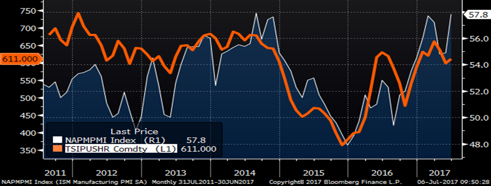 Since we last met, the June ISM Manufacturing PMI gained a solid 2.9 points to 57.8 and beat consensus expectations of 55.3 by 2.5 points! The chart below compares the TSI Daily HRC Index with the ISM Manufacturing PMI and it sure looks like the TSI Midwest HRC price needs to play some catch-up.