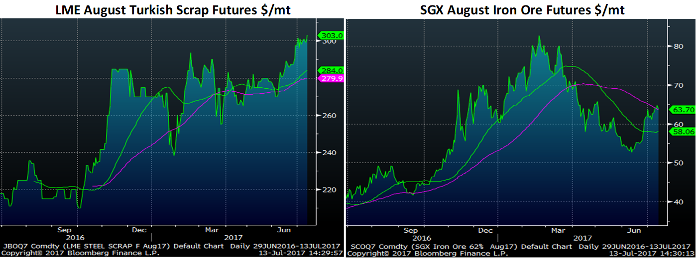 Today, the August LME Turkish scrap future settled at $303/mt while the August SGX iron ore future settled at $63.70/mt. Since June 1, LME scrap is up 9.4 percent and SGX ore is up 17.5 percent…kind of quietly.