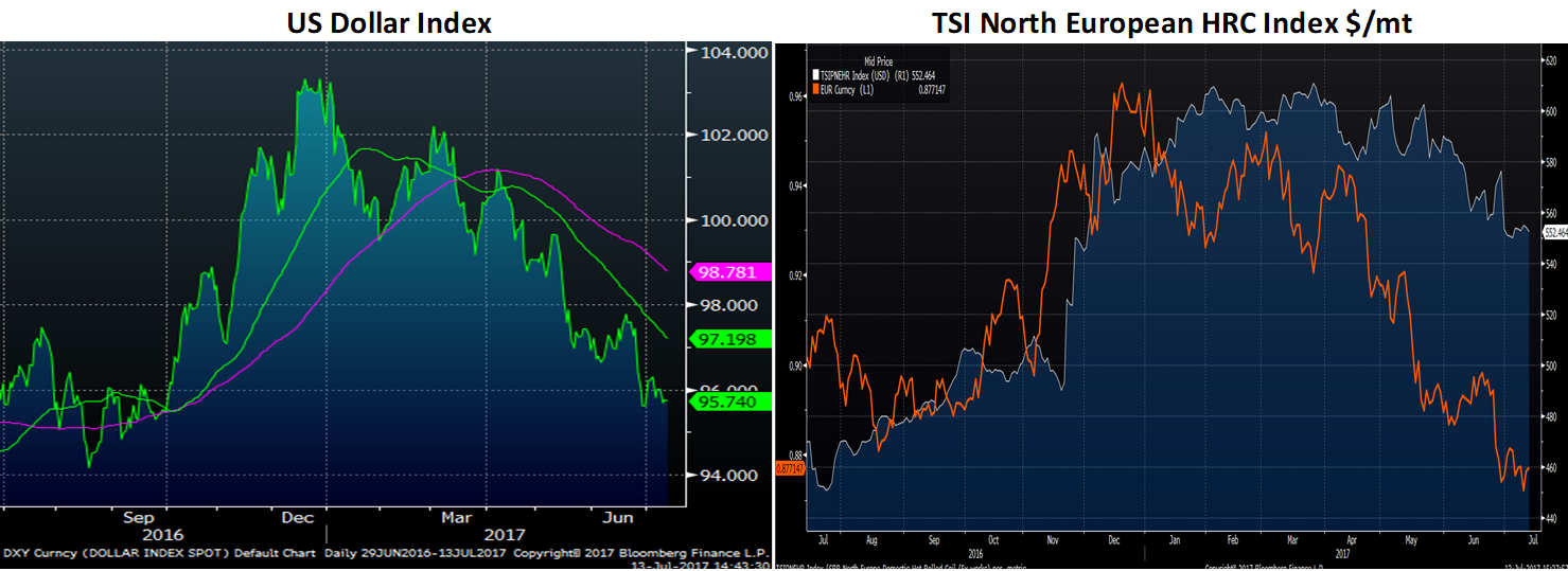The dollar continues to make new lows, and a weaker dollar inflates commodity prices. The chart on the right compares the TSI North European HRC $/mt with the USD/Euro cross. In this case, the appreciation in the euro/weakness in the U.S. dollar looks to be a big reason for the downward pressure on the North European HRC price, as opposed to weak manufacturing. The Eurozone PMI is at 57.4, and the German PMI at 59.6 is the highest of any of the major global economies.