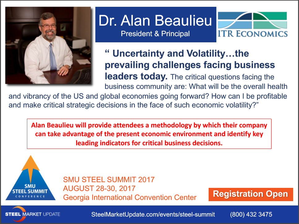 We’re in for a good year ahead, says popular economist Alan Beaulieu of ITR Economics, who will be a keynote speaker during Steel Market Update’s 2017 Steel Summit Aug. 28-30 at the Georgia International Convention Center in Atlanta.