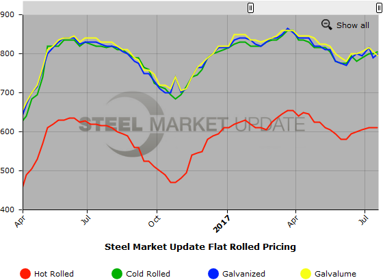 SMU Note: Below is a graphic showing our hot rolled, cold rolled, galvanized, and Galvalume price history. We will add plate prices to this graph once we have gathered a few months of data. To use the graph’s interactive capabilities, you must view it on our website here. If you need help navigating the website or need to know your login information, contact us at info@SteelMarketUpdate.com or by calling 800-432-3475.