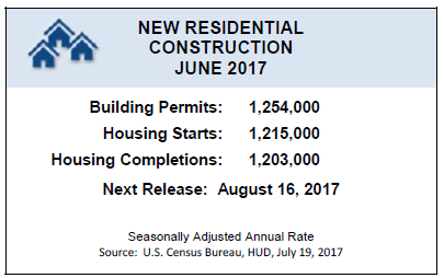 Housing starts in June jumped 8.3 percent to a seasonally adjusted annual rate of 1,215,000 and were 2.1 percent higher than in June 2016, said the Department of Commerce on Wednesday. The increase follows three months of decline and was driven by new construction in the Northeast and Midwest.