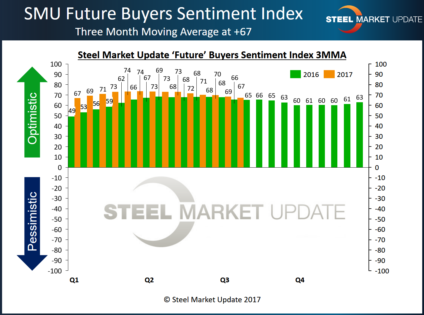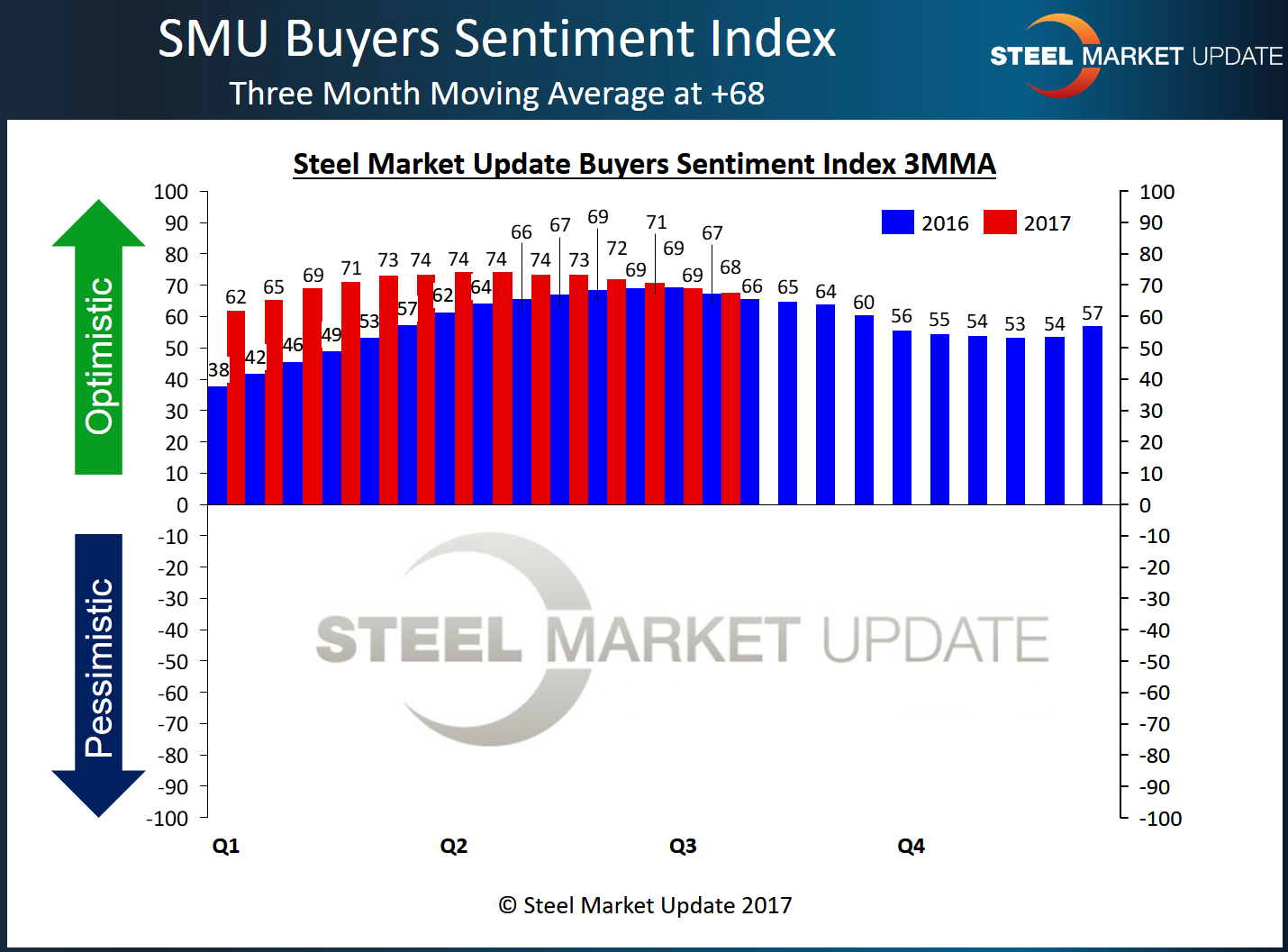 SMU Steel Buyers Sentiment Index is a measurement of the current attitude of buyers and sellers of flat rolled steel products in North America regarding how they feel about their company’s opportunity for success in today’s market. It is a proprietary product developed by Steel Market Update for the North American steel industry. Positive readings will run from +10 to +100 and the arrow will point to the right-hand side of the meter located on the Home Page of our website indicating a positive or optimistic sentiment.