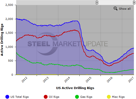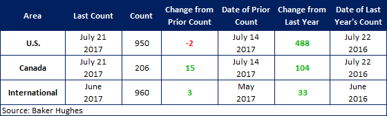 Data from July 7, 2017, shows the U.S. rig count for the week was 950 rigs exploring for or developing oil or natural gas, reports oilfield services company Baker Hughes, Inc. This is down 2 rigs compared to last week, with oil rigs down 1 to 764 rigs, gas down 1 to 186 rigs, and miscellaneous rigs unchanged at 0 rigs. Compared to this time last year, the 950 count is up 488 rigs, with oil rigs up 393, gas rigs up 98, and miscellaneous rigs down 3.