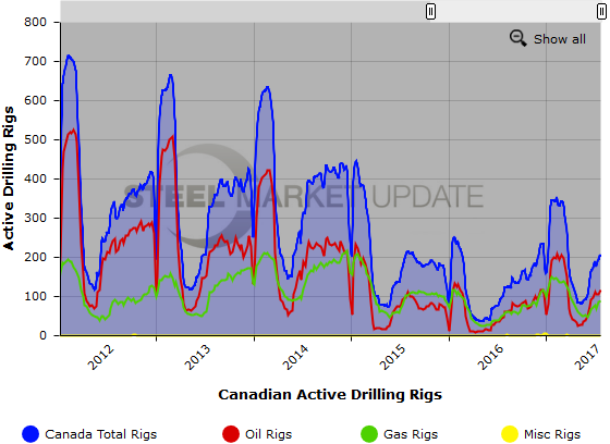 The Canadian rig count increased by 15 to 206 rigs this past week, with oil rigs up 12 to 118 rigs, gas rigs up 3 to 88 rigs, and miscellaneous rigs unchanged at 0 rigs. Compared to last year, the 206 count is up 104 rigs, with oil rigs up 70, gas rigs up 35, and miscellaneous rigs down 1.