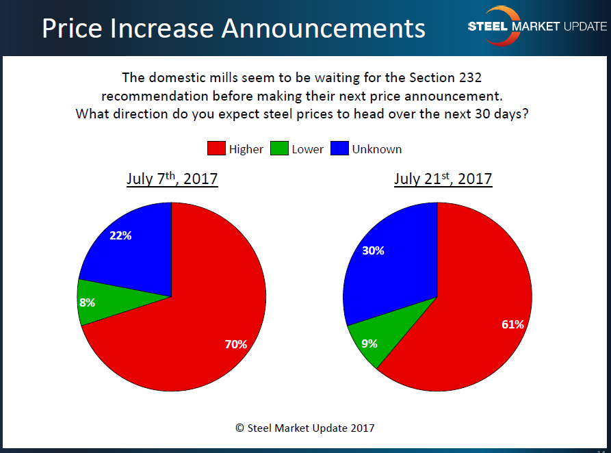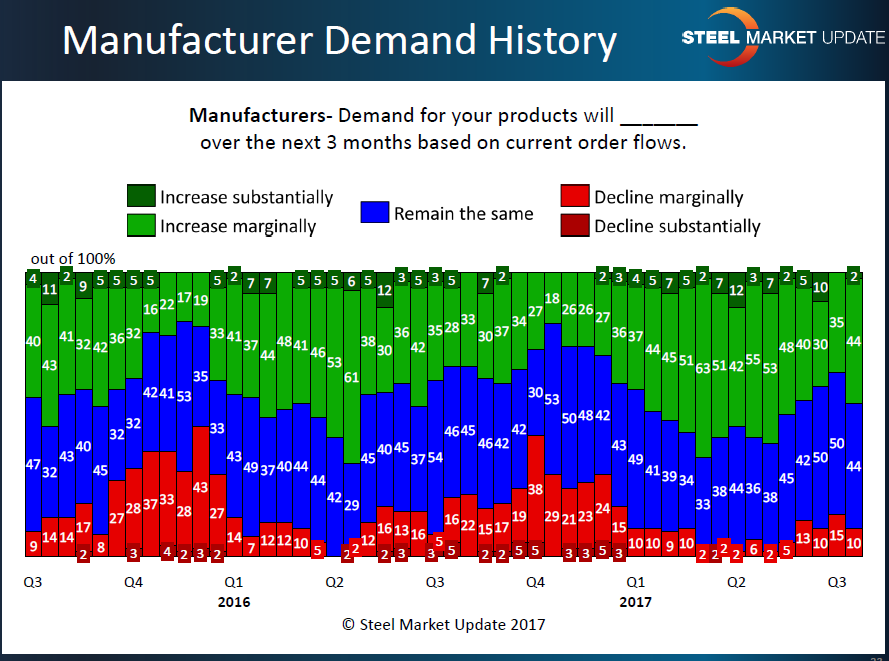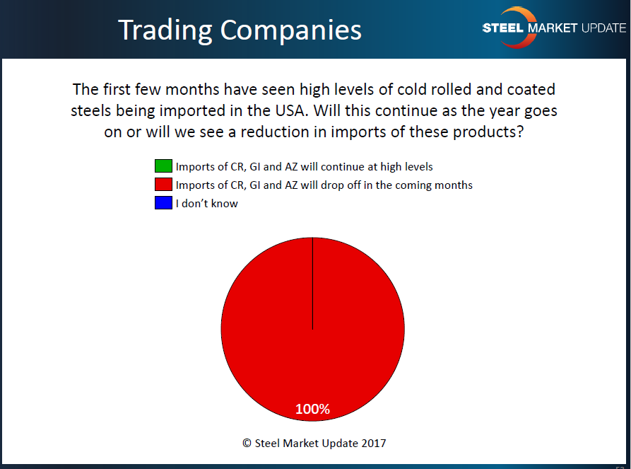 We package a great many of the responses provided into a PowerPoint presentation format and then provide those who participated in the questionnaire a link. At the same time, we post the presentation on our website so it can be accessed at any time by those who are Premium members of Steel Market Update. Premium members can find the past and current surveys under the Analysis tab on our website.