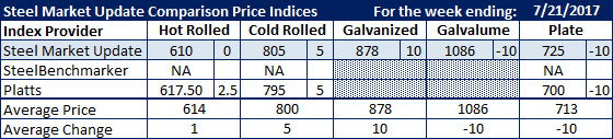 The week ending July 21 was another mixed week for flat rolled steel and plate prices. Steel Market Update (SMU) steel price indices saw two products as being higher, two lower and one unchanged. Platts had two higher and one lower. SteelBenchmarker did not report prices this week as they only report twice per month.