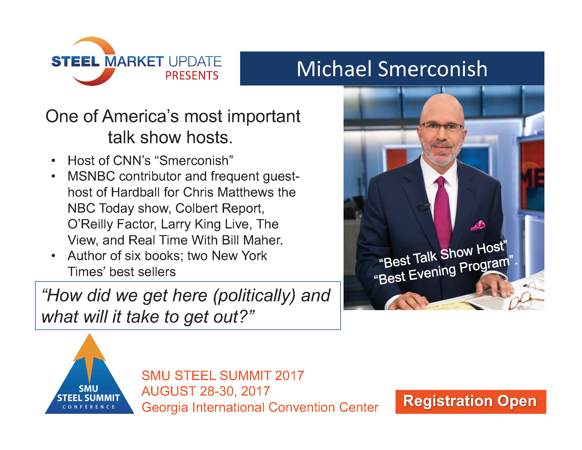 We highly encourage attendees to book your flights for a 5 p.m. or later departure so you don’t miss Smerconish (who begins at 12:45 p.m. on Wednesday) and the equally impressive panel of exceptional young executives who will discuss what companies can do to attract, hire, train and maintain young people in manufacturing and steel-related jobs.
