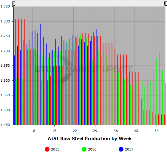 Below is a graph showing the history of weekly raw steel production. You will need to view the graph on our website to use its interactive features, you can do so by clicking here. If you need assistance logging into or navigating the website, please contact our office at 800-432-3475 or info@SteelMarketUpdate.com.