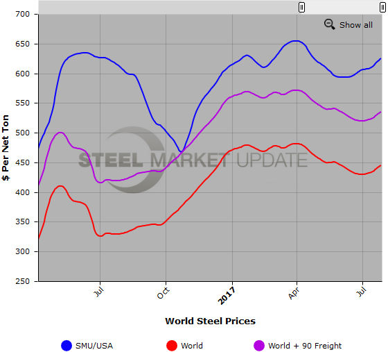 The SteelBenchmarker world export price for hot rolled bands is $445 per net ton ($491 per metric ton) FOB the port of export, according to data released by SteelBenchmarker on Monday, July 24. This is up $12 from the previous release on July 10, and up $15 from one month ago. Adding in $90 in estimated import costs, that puts prices around $535 per ton delivered to the U.S. As previously mentioned, the latest Steel Market Update hot rolled price average is $625 per ton.