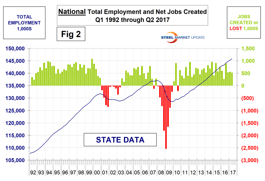 The states compile their employment numbers independently of the Feds, and then both are reported by the Bureau of Labor Statistics. The results are close. In the last 18 quarters since Q1 2013, the Feds reported total job creation of 11,340,000 and the states reported 11,461,000, a difference of only 0.11 percent. Part of this small discrepancy is that the Feds capture offshore military personnel, but the states don’t. Figures 1 and 2 show the history of Federal and State totals since 1992. SMU has graphs in the same format for 10 geographic regions and can produce for individual states if a reader so requests.
