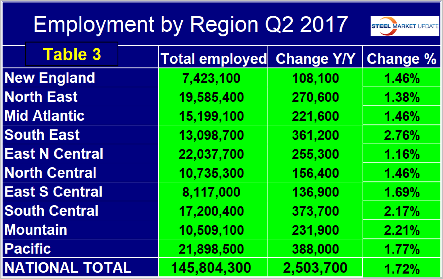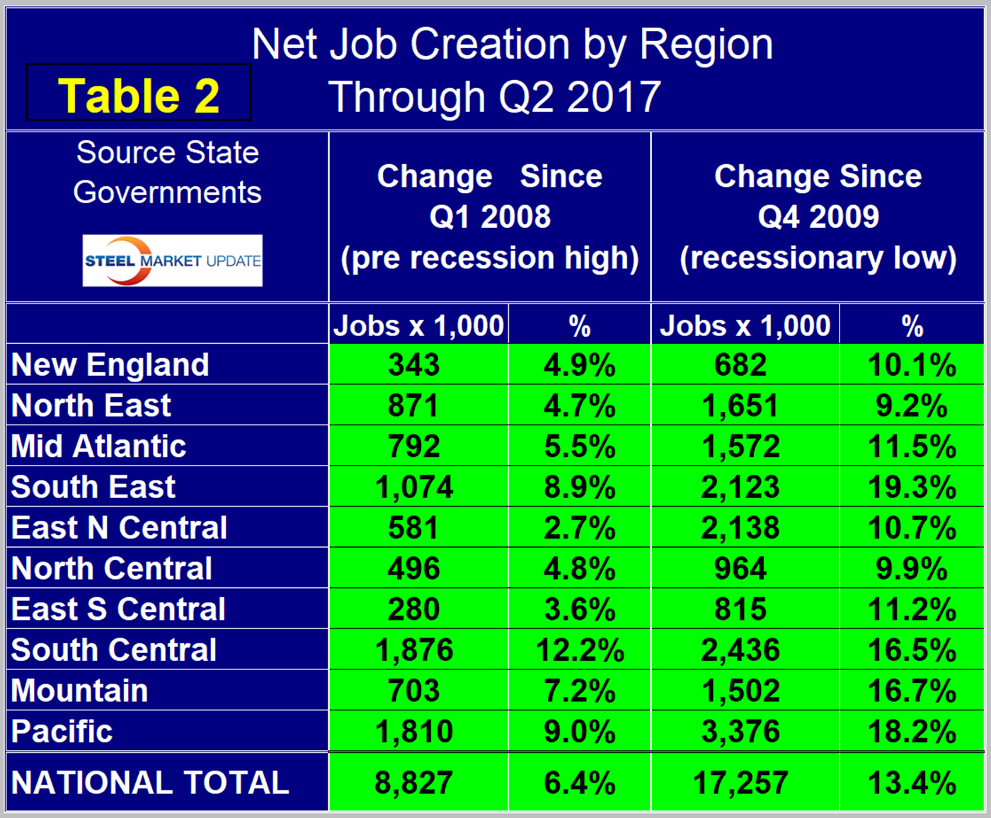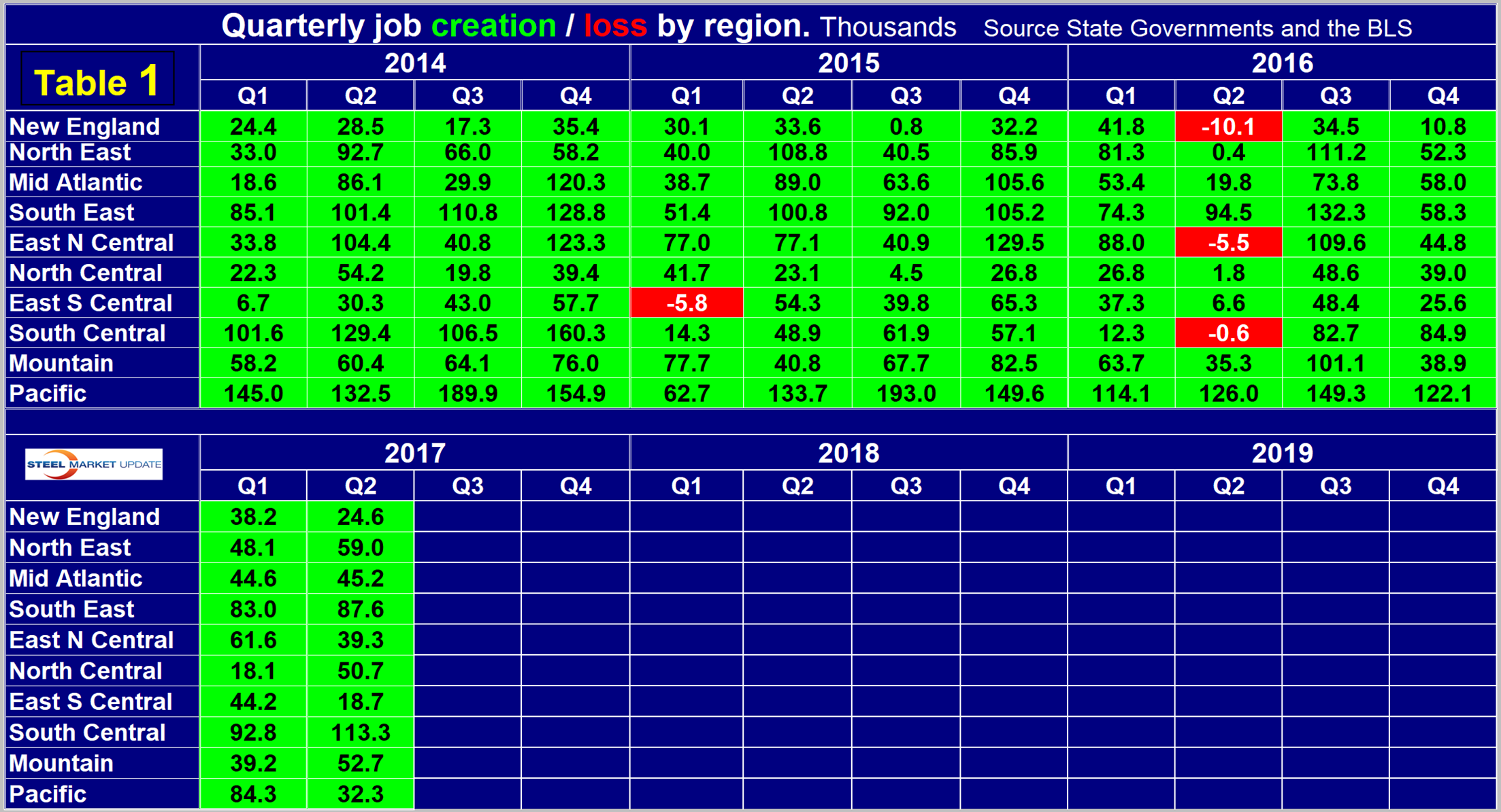 Table 1 shows the history of quarterly job creation by region since Q1 2014 (click image to enlarge).
