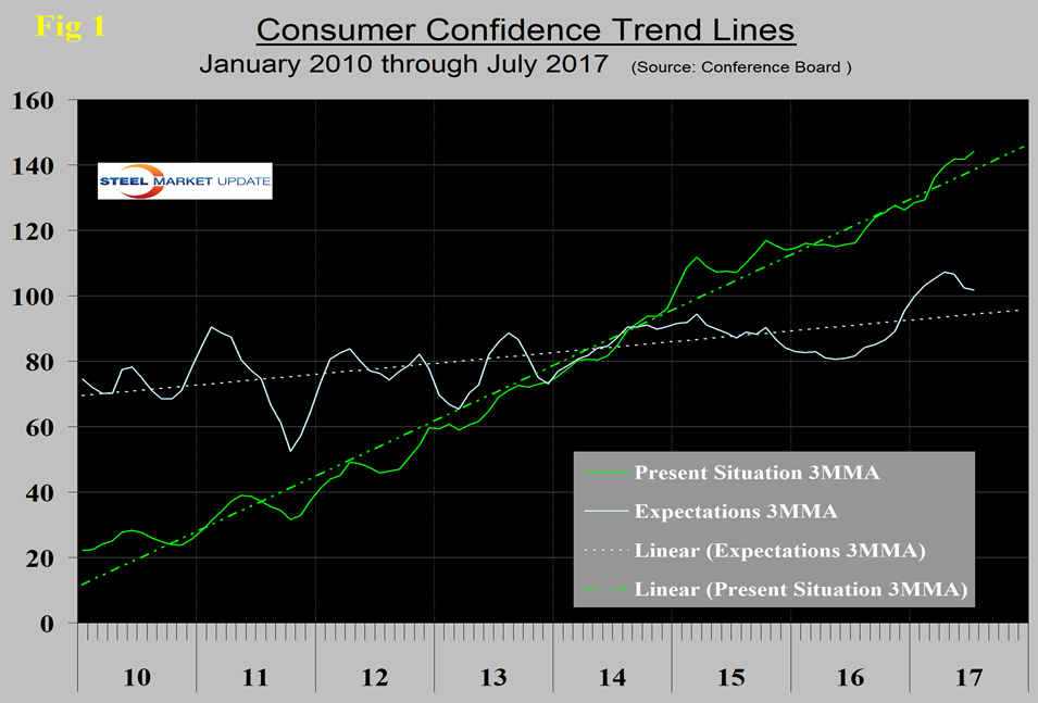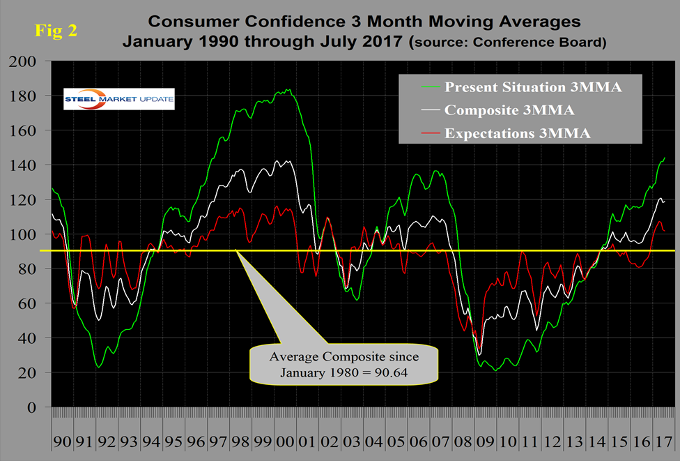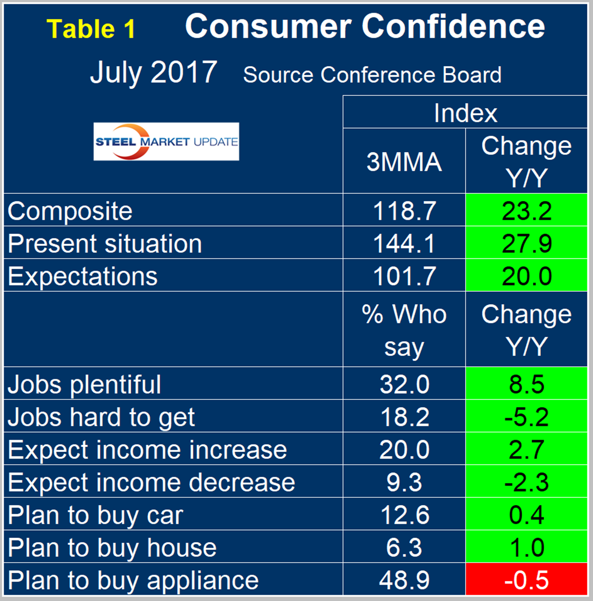 SMU Comment: Consumer confidence continues to be historically positive, both the view of the present situation and expectations. The employment sub-indexes are good, which will drive personal consumption, the largest component of GDP. This, in turn, will have a positive effect on steel consumption.