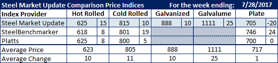 Cold rolled saw similar movement in its average pricing with SMU having the highest average at $815 per ton, followed by SteelBenchmarker at $801 and Platts at $800.