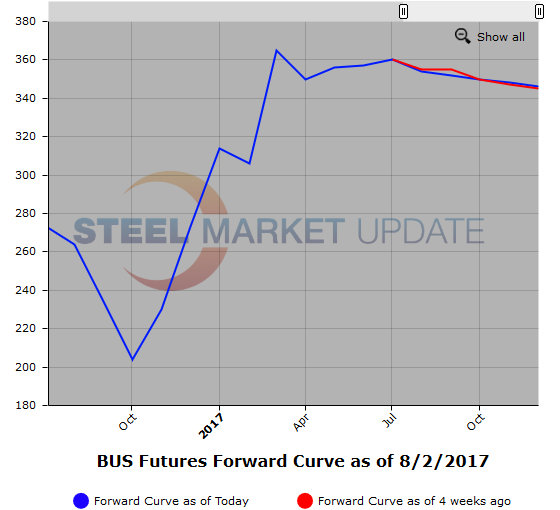 Concern around supplies of U.S. prime scrap have kept the BUS contract well bid. Latest has the balance of 2017 BUS curve around $355/GT. The chatter has August index coming in up $10-15/GT over July ($366/GT) for BUS. The BUS futures curve remains slightly backwardated, but is starting to flatten slightly based on the latest metal margin interests.