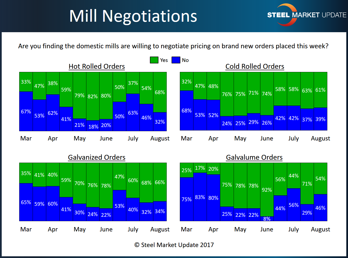 By product category, 68 percent of manufacturing and service center respondents saw mills willing to negotiate hot roll orders, up from 54 percent in the last survey. In cold roll, the percentage dipped slightly to 61 percent who found the price negotiable, from 63 percent two weeks ago. Galvanized also saw a slight dip to 66 percent from 68 percent, while Galvalume declined to 54 percent from 71 percent, indicating less willingness to talk price on coated products.