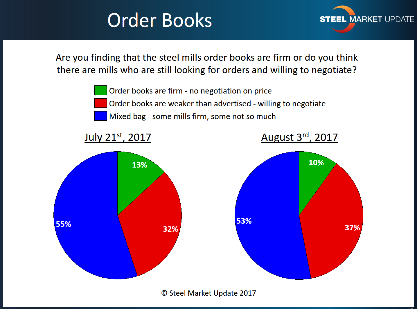 Over the course of this week, Steel Market Update has been canvassing active participants in the flat rolled steel markets as we try to capture any changes in market trends. The more than 100 respondents we had this week provided us a snapshot on how steel mills are handling price negotiations. As a group, respondents reported mills sending mixed signals on their willingness to negotiate steel prices. The majority of respondents (53 percent) to this week’s flat rolled market trends questionnaire report that some mills are open to negotiation, while others are not. Another 37 percent say mill order books are weaker than expected and mills do tend to be open to price discussions. Only 10 percent have found that mill order books are full and negotiation is off the table.