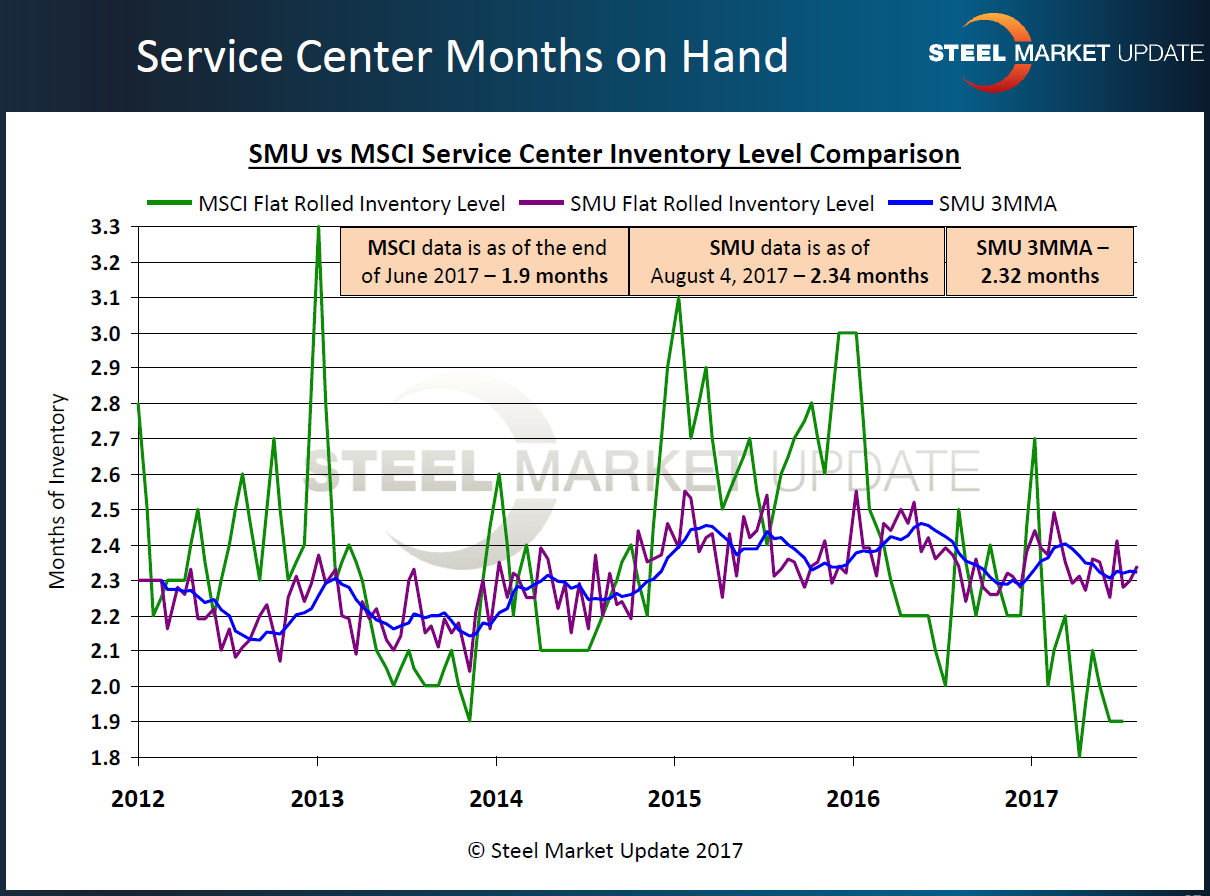 We continue to review inventory levels through the use of our flat rolled steel market trends questionnaire that we distribute twice per month. We usually get approximately 50 service centers of various sizes participating in any one query. We have found over the years that the steel service centers responding tend to keep their inventories in a range from 1.75 months to as high as 3.5 months. We then average all of the numbers (not weighted) to come up with our months on hand average, which this past week was 2.34 months supply.