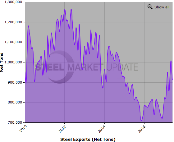 Hot rolled steel exports decreased 5.4 percent month over month to 86,971 tons, but were up 52.0 percent from June 2016 levels.