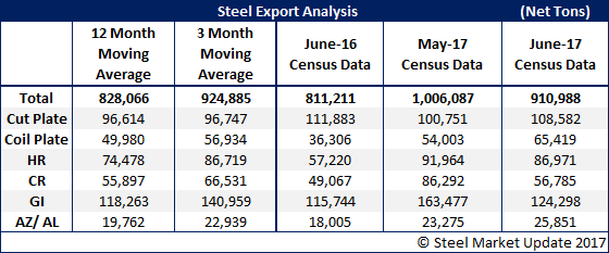 U.S. steel exports in June totaled 910,988 net tons (826,435 metric tons), down 9.5 percent over May, but up 12.3 percent from June 2016. Although down over last month, total June exports are in line with the average monthly level over the last few months. Back in May, total exports had climbed to 1,006,087 tons, a 2.5-year high. The total June export figure is below the three-month moving average (average of April 2017, May 2017 and June 2017), but above the 12-month moving average (average of July 2016 through June 2017). Here is a breakdown of flat rolled and plate steel exports: