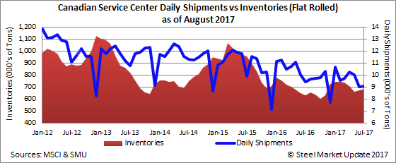 Steel shipments by Canadian service centers in July totaled 346,500 net tons, down 11.7 percent from the previous month, but up 8.7 percent from July 2016, reports the Metals Service Center Institute (MSCI). On a daily basis, total shipments were 17,300 tons per day in July (a 20-day month), down from 17,800 tons per day in June (a 22-day month), but up compared to a year ago when they were 15,900 tons per day (a 20-day month). Total steel inventories at the end of the month were 1,173,800 tons, up 3.1 percent from last month and up 6.6 percent from this time last year.