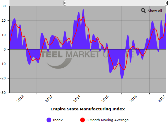 Below is a graph showing the history of the Empire State Manufacturing Index. You will need to view the graph on our website to use its interactive features, you can do so by clicking here. If you need assistance logging into or navigating the website, please contact our office at 800-432-3475 or info@SteelMarketUpdate.com.