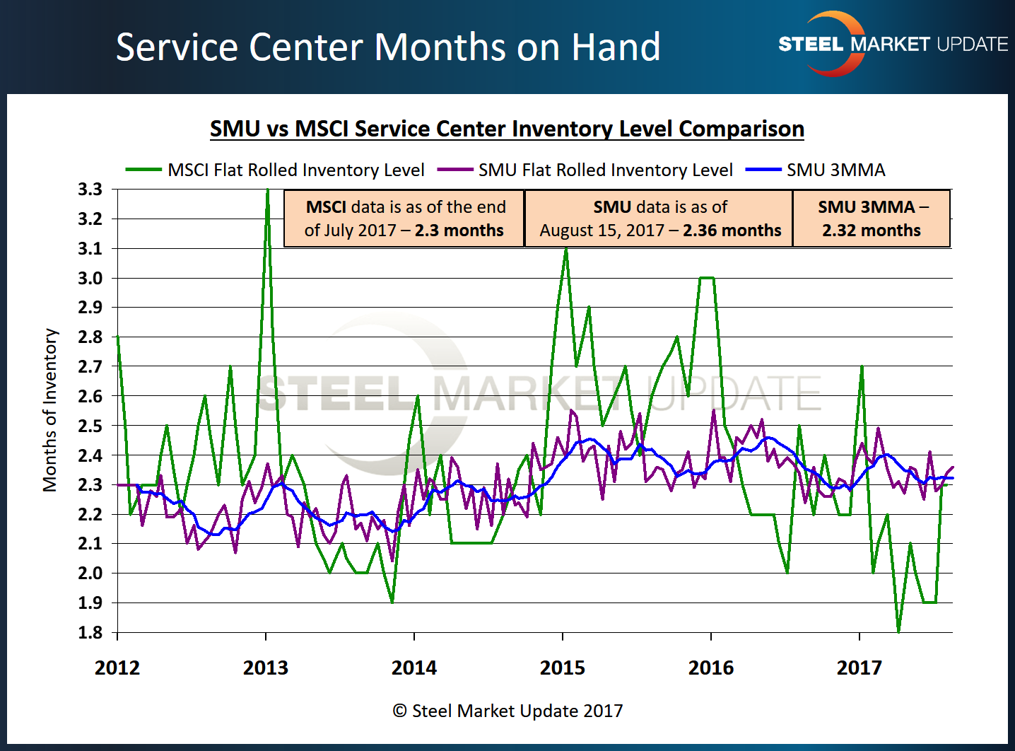 Last week, Steel Market Update worked with 20 service centers who provided SMU with their inventory levels as of the end of July. Based on the 20 service centers, which cover medium to large service center groups, the number of months’ supply was 2.80 months. We will continue to work with and expand the number of service centers canvassed in the months to come.