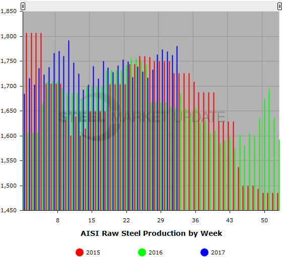 Below is a graph showing the history of weekly raw steel production. You will need to view the graph on our website to use its interactive features, you can do so by clicking here. If you need assistance logging into or navigating the website, please contact our office at 800-432-3475 or info@SteelMarketUpdate.com.