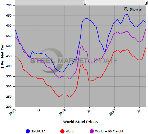Below is a graph comparing SteelBenchmarker world HR export prices against the SMU domestic HR average price (we will build new data using Platts and replace the SteelBenchmarker data shortly). We also have included a comparison with freight and traders’ costs added, which gives you a better indication of the true price spread. You will need to view the graph on our website to use its interactive features; you can do so by clicking here. If you need assistance with either logging in or navigating the website, please contact us at 800-432-3475 or info@SteelMarketUpdate.com.