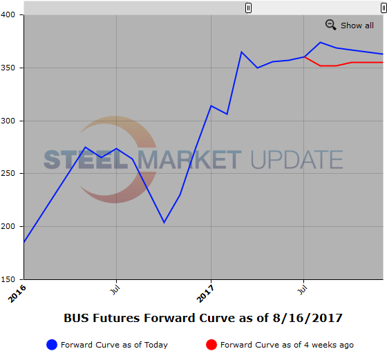 Focus around supplies of U.S. prime scrap continues to keep the BUS contract well bid. This week, Q4 BUS traded $365 on 700gt/m and Sep-Dec’17 traded @ $366 on 200gt/m.