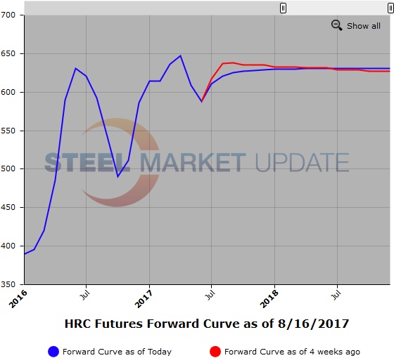 Below is a graph showing the history of the hot rolled futures forward curve. You will need to view the graph on our website to use its interactive features; you can do so by clicking here. If you need assistance with either logging in or navigating the website, please contact our office at 800-432-3475 or info@SteelMarketUpdate.com.