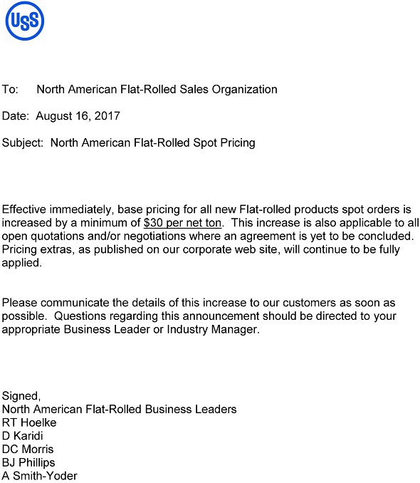 On Wednesday, U.S. Steel advised customers of their intention to raise prices by $30 per ton. The U.S. Steel announcement letter was the first one seen in quite some time. USS has been informing their customers via one-on-one discussions as opposed to putting out what soon becomes a public document.