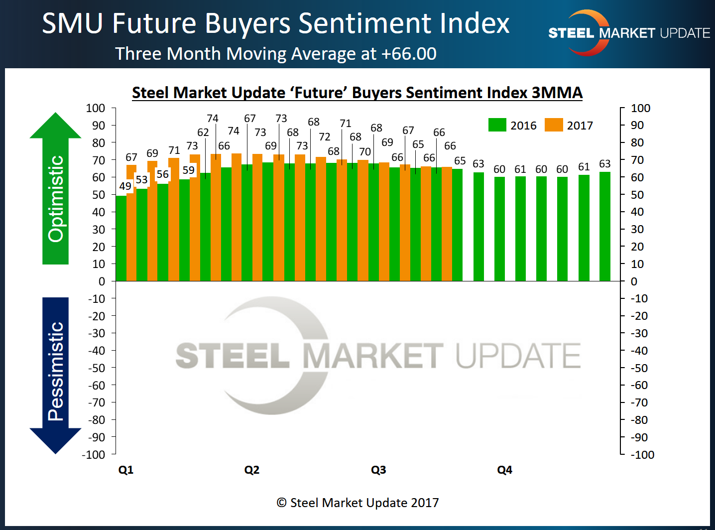 Steel Market Update (SMU) is releasing our SMU Steel Buyers Sentiment Index for mid-August. The Index measures how buyers and sellers of flat rolled steel feel about their company’s ability to be successful both in the current market environment, as well as three to six months into the future. Overall, our Indexes remains optimistic. However, the trend since the beginning of May 2017 has been for the level of optimism to be lower than what we were seeing earlier in the year.