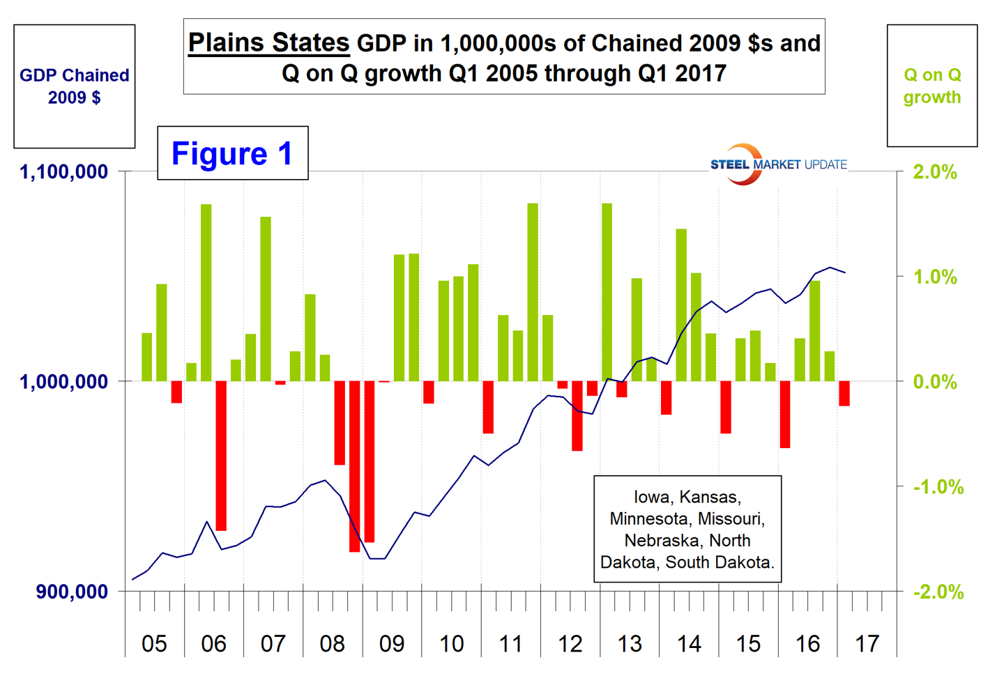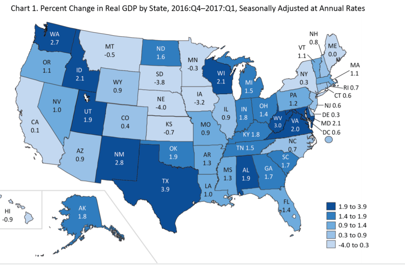 Gross domestic product grew in every region except the Plains States in Q1 2017.