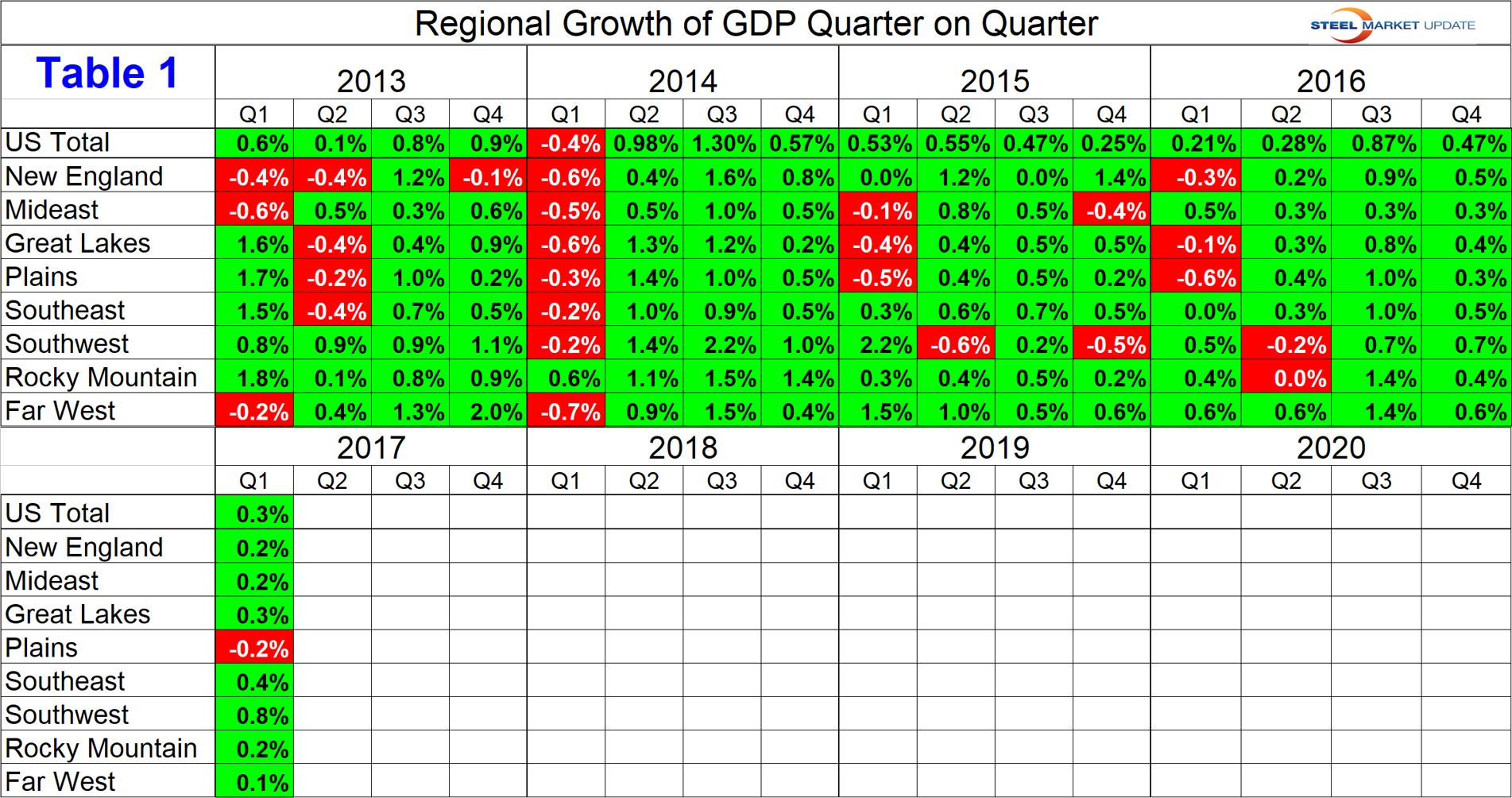 Table 1 shows the growth of regional GDP in chained 2009 dollars quarter on quarter. (These numbers are not annualized as is the case for published reports of the growth of national GDP.) In the 3rd and 4th quarters of 2016, every region had positive growth. Except for the Plains States, this continued into Q1 2017.