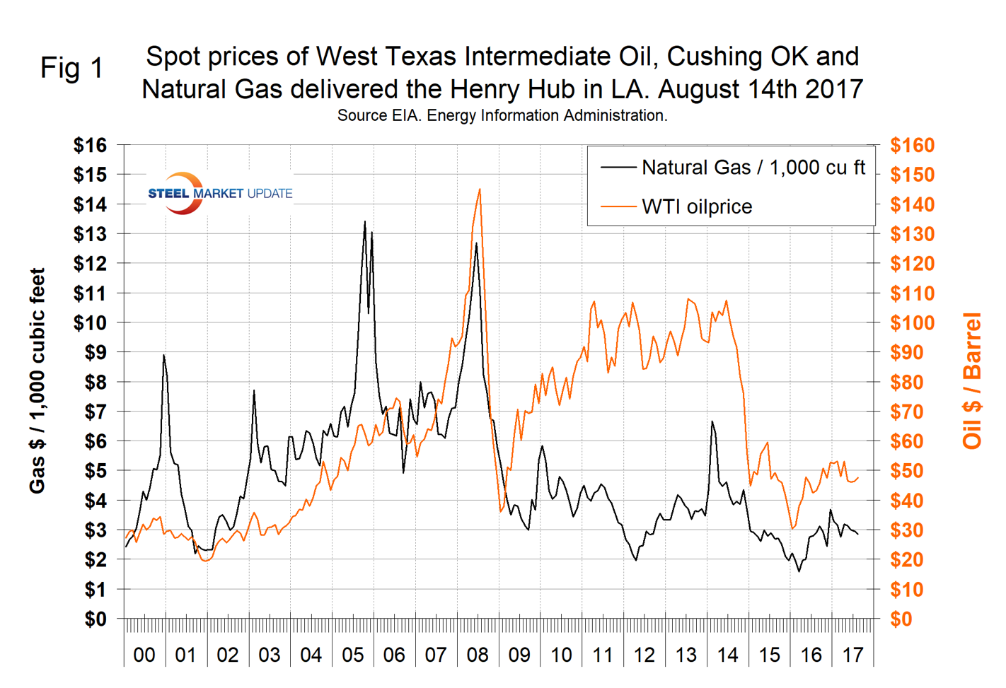 In the last month, the price of crude oil has risen and the price of natural gas has declined slightly. The number of operating rigs exploring for both oil and gas has declined for three straight weeks. This is the first decline since the low point of June 27 last year. The prices of oil and natural gas drive the consumption of energy-related steel products including oil country tubular goods, pipe fittings and well head equipment, among others. A significant volume of hot rolled coil is used to make welded tubular goods.