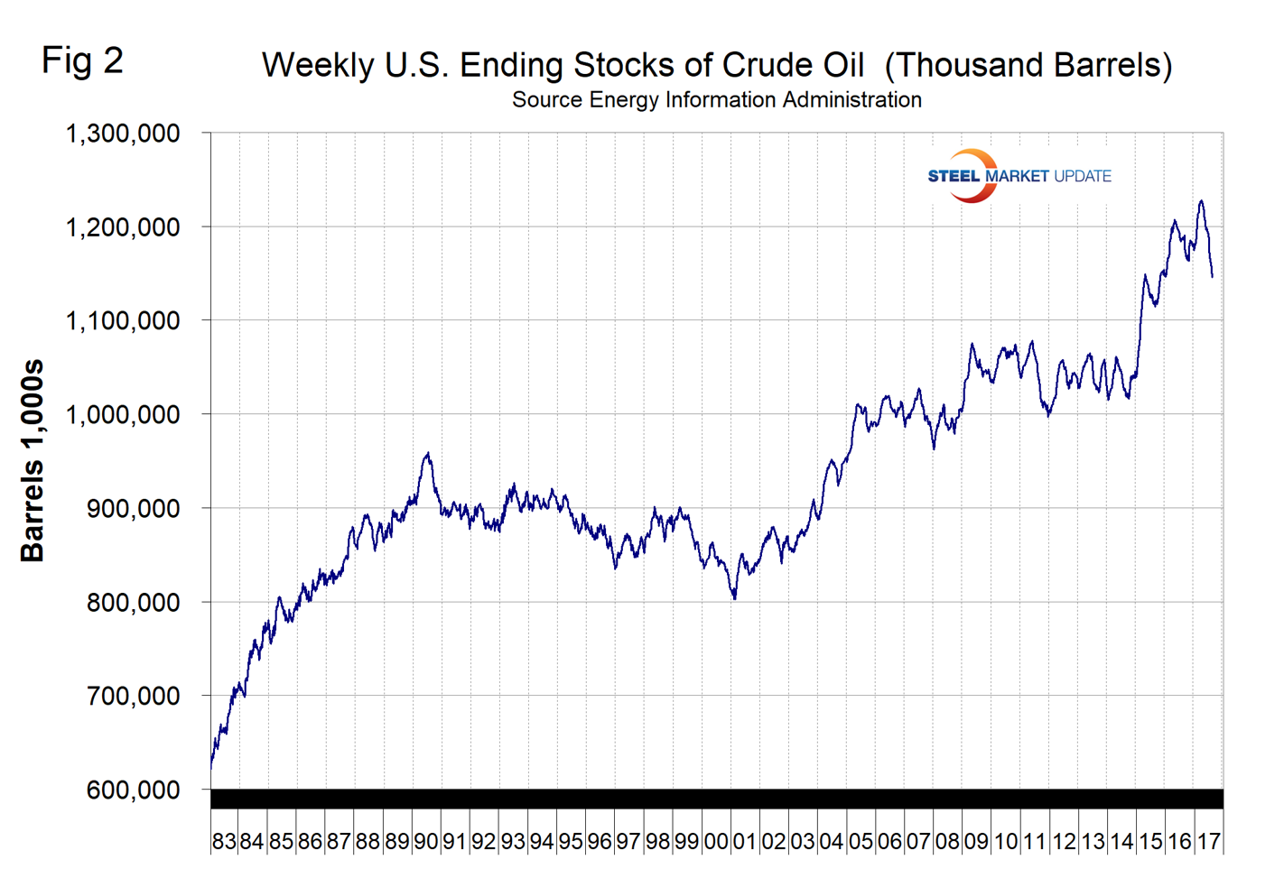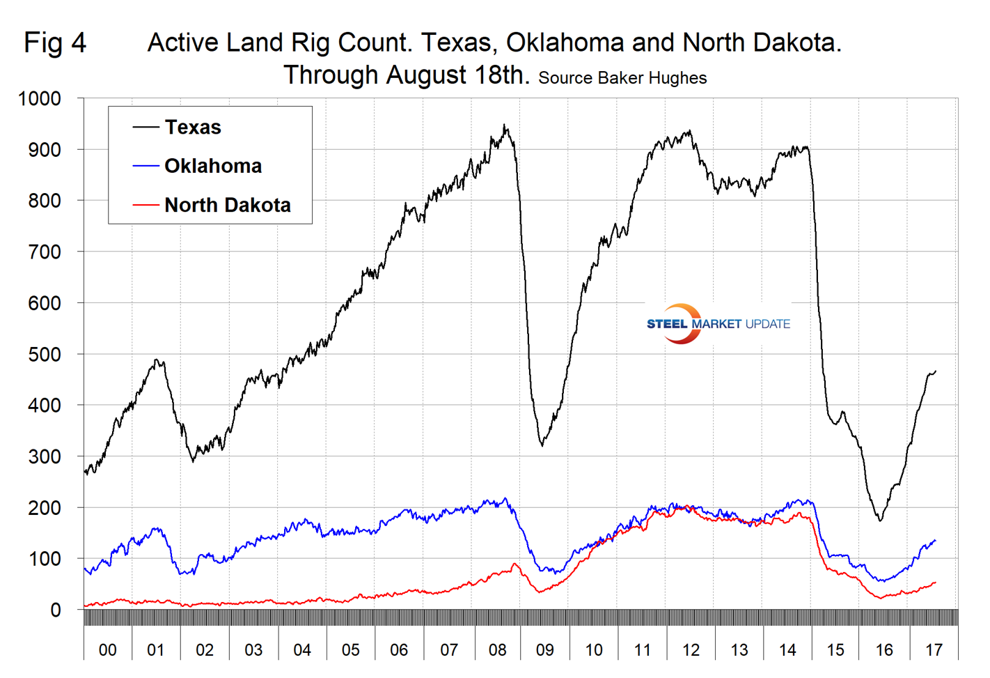 In the last month, the price of crude oil has risen and the price of natural gas has declined slightly. The number of operating rigs exploring for both oil and gas has declined for three straight weeks. This is the first decline since the low point of June 27 last year. The prices of oil and natural gas drive the consumption of energy-related steel products including oil country tubular goods, pipe fittings and well head equipment, among others. A significant volume of hot rolled coil is used to make welded tubular goods.