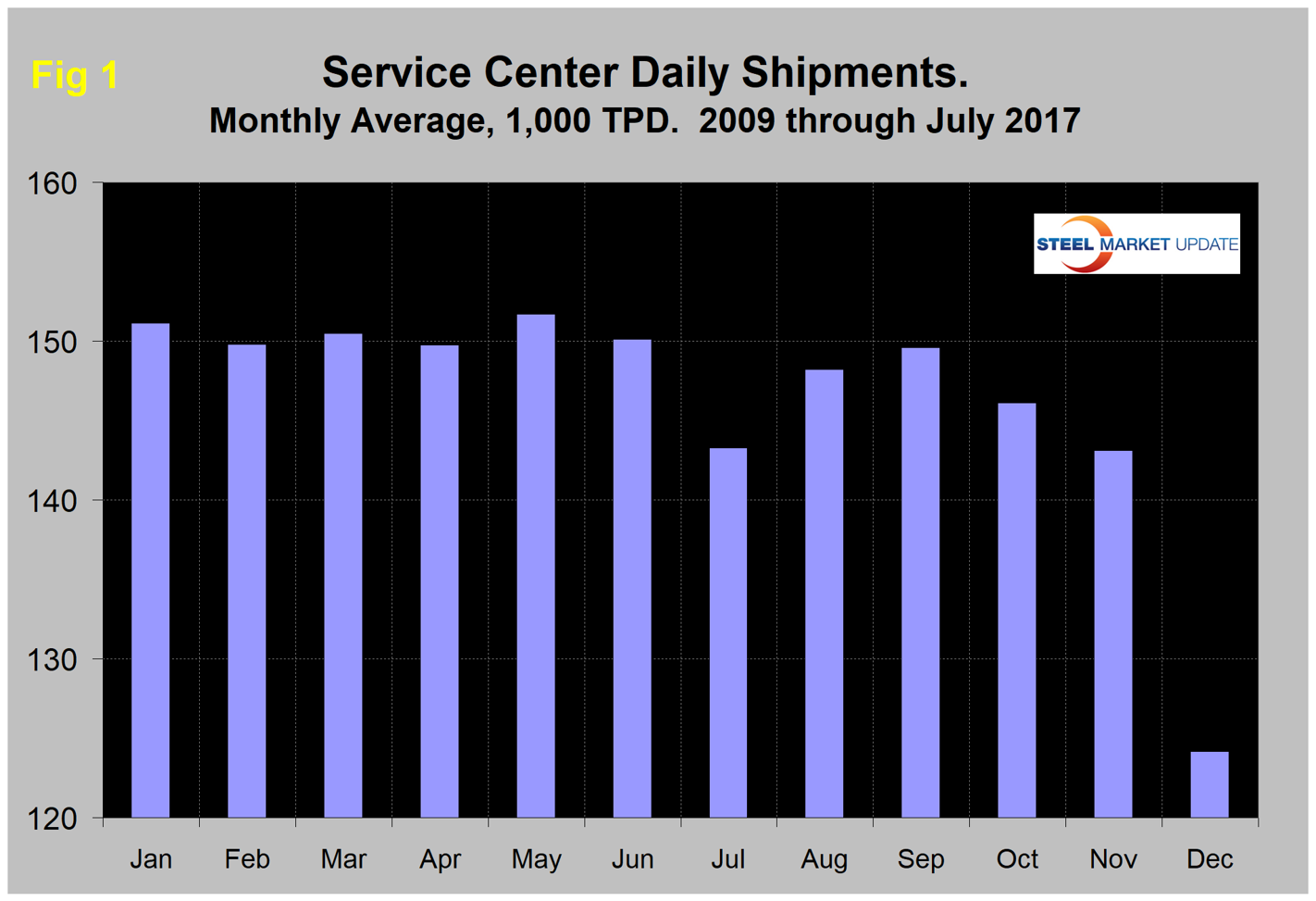 Service center shipments took the normal dip in July, but the decline was slightly more than the historical average. Months on hand at the end of July were up sharply, partly because of a decline in shipping days, according to Steel Market Update’s latest analysis of Metals Service Center Institute data.