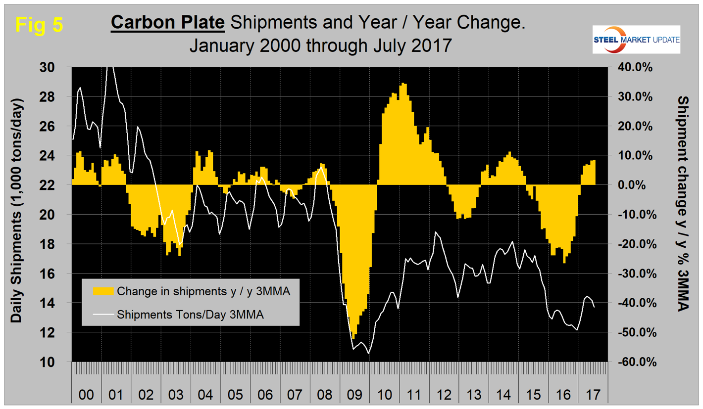 July this year was up by 1.3 percent from July 2016, but down by 1.6 percent from the three-year July average. The fact that the y/y growth comparison is better than the three-year comparison suggests that momentum is positive. Shipments of plate and long products were up from July last year, but sheet and tubulars were down. This was the same pattern we observed in the June data.